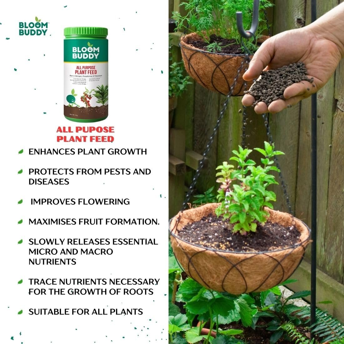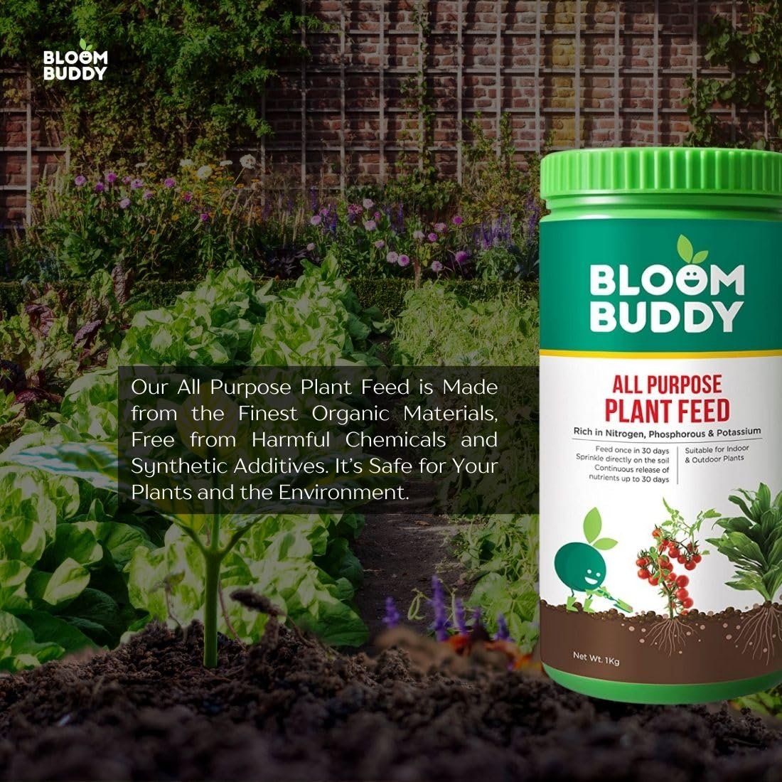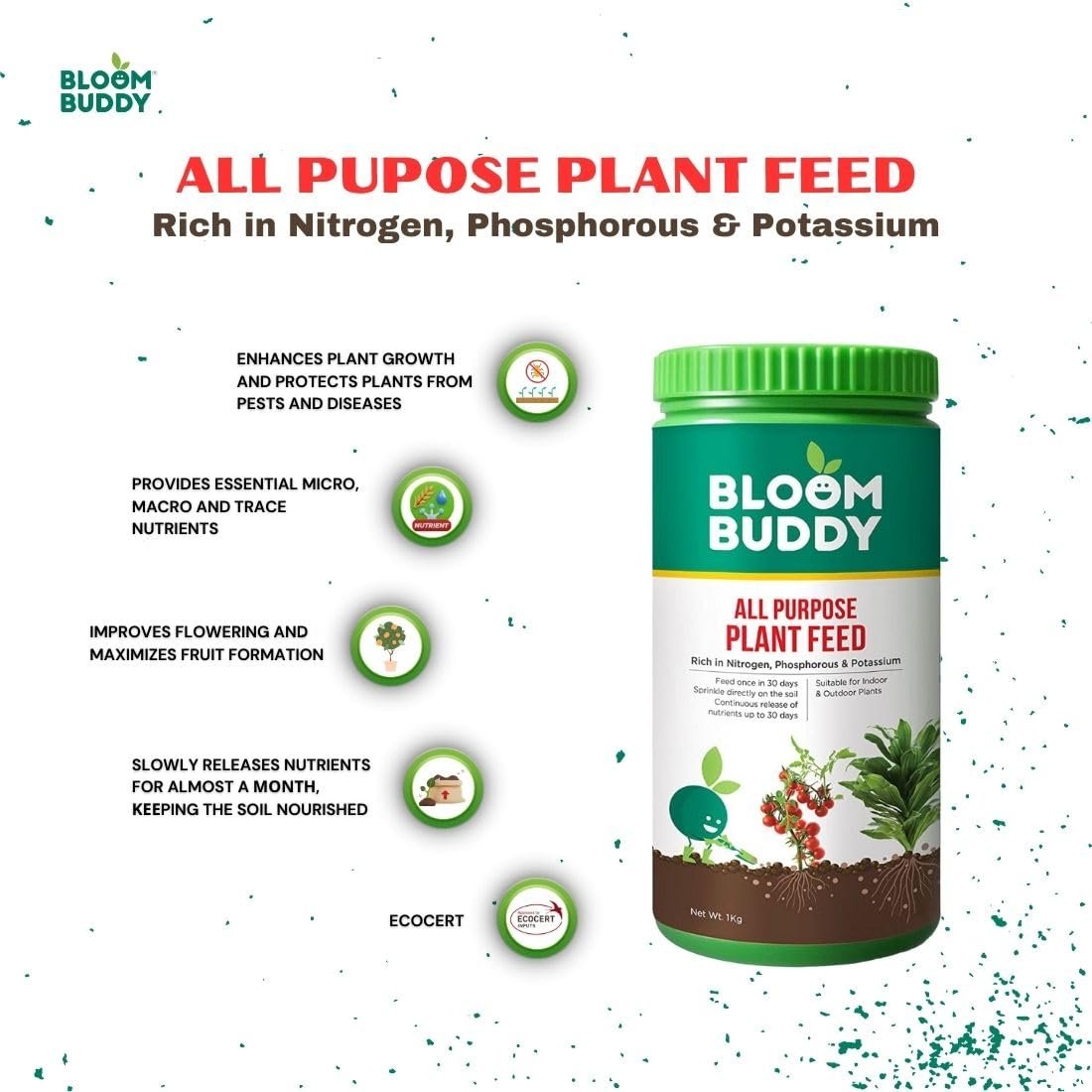 All Purpose NPK Fertilizer & Organic Manure: BloomBuddy All Purpose Plant Feed is a premium plant fertilizer for pot plants, indoor plants, and home gardens. It combines organic fertilizer for plants home garden with NPK fertilizers for plants, press mud, and cowdung manure for plants for complete nourishment