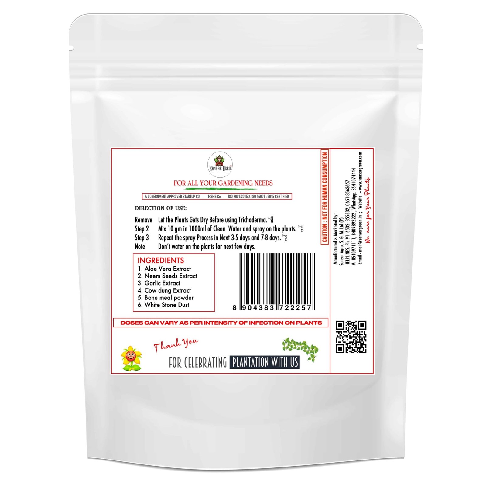 🍀EASY APPLICATION: Individual Plants—Mix 5g of Trichoderma viridi Powder with 1 liter of water and apply directly to plant soil. SEED TREATMENT—Mix 10 g of Trichoderma viride with 1 kg of seeds. ROOT DIPPING: Mix 100 g of Trichoderma viridi with 10 liters of water. POTTING SOIL: Mix 100 g of Trichoderma viride with 15-20 liters of potting soil.